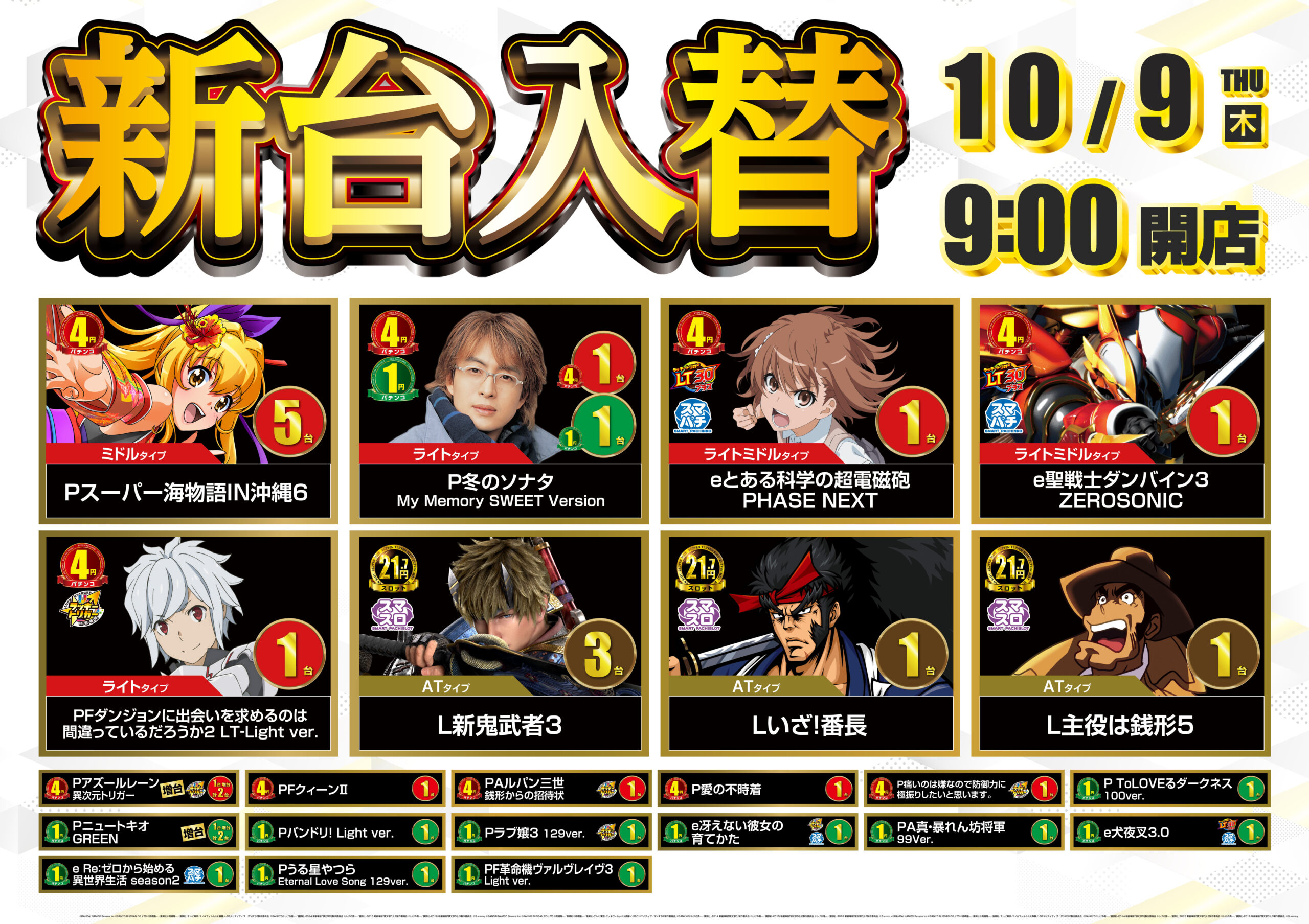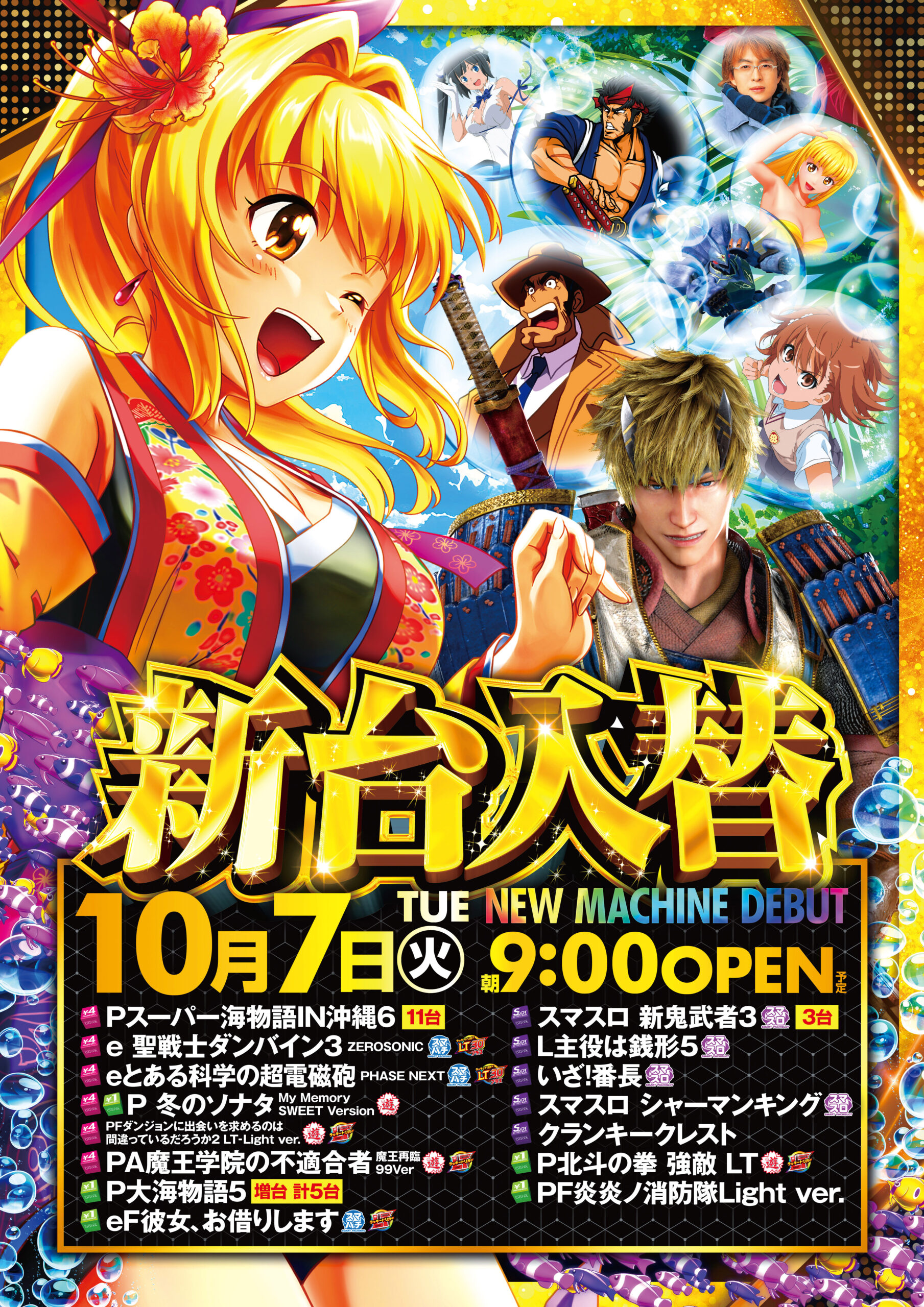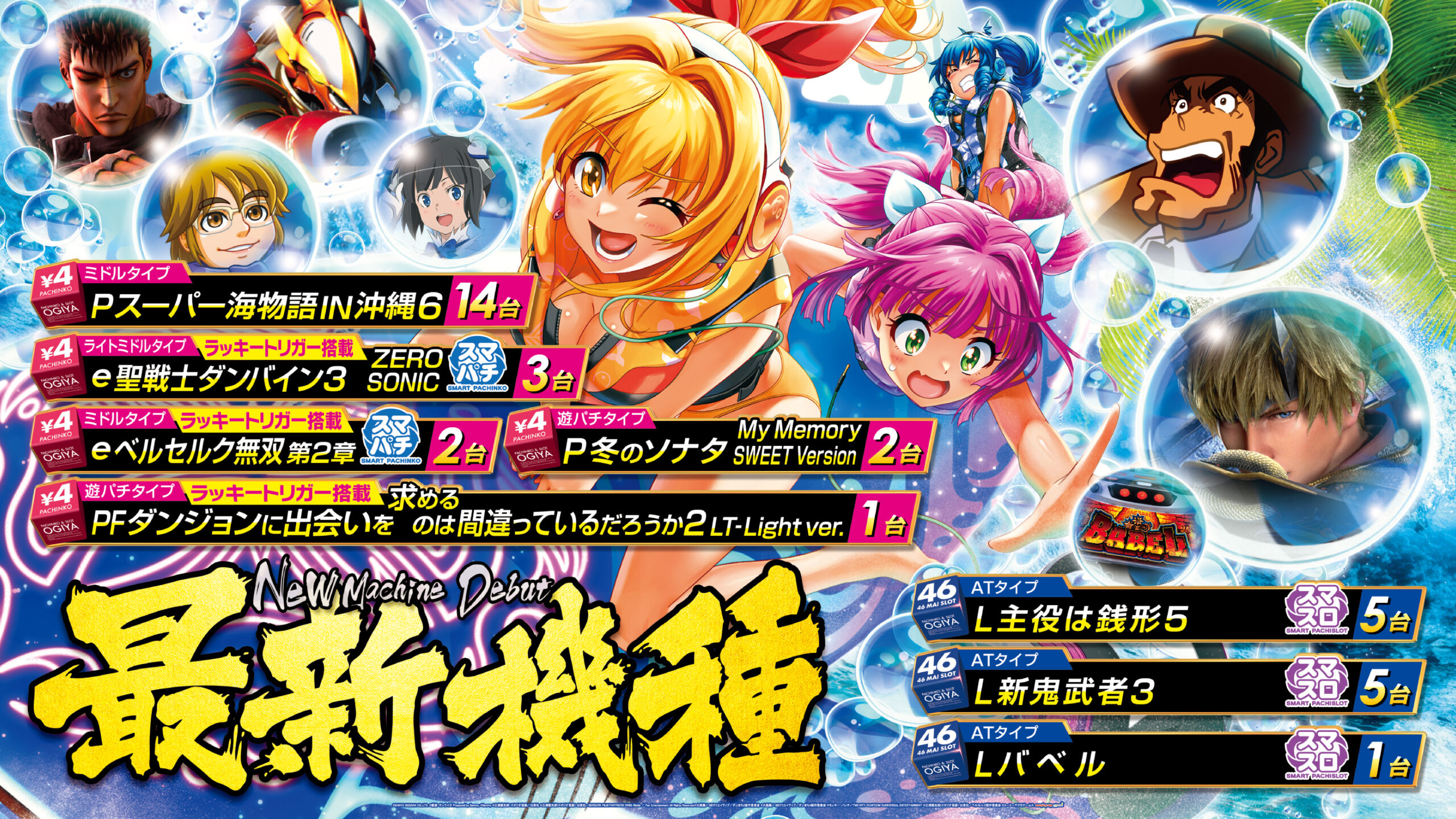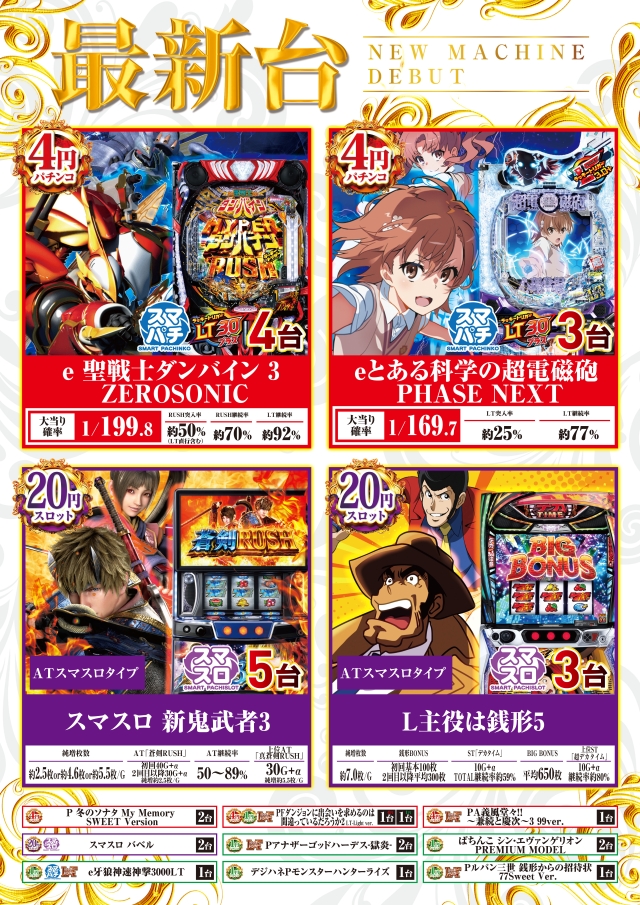 パチンコ Pスーパー海物語IN沖縄6 ハイミドル4台 eとある科学の超電磁砲PHASE NEXT ライトミドル2台 e聖戦士ダンバイン3ZEROSONIC ライトミドル2台 eガールズ&パンツァー最終章 ライトミドル2台 P冬のソナタMy Memory SWEET Ver 甘デジ2台 eベルセルク無双第2章 ハイミドル1台 PA義風堂々!!3 甘デジ1台 デカスタPシュタインズゲートゼロ 甘デジ1台