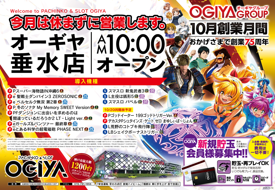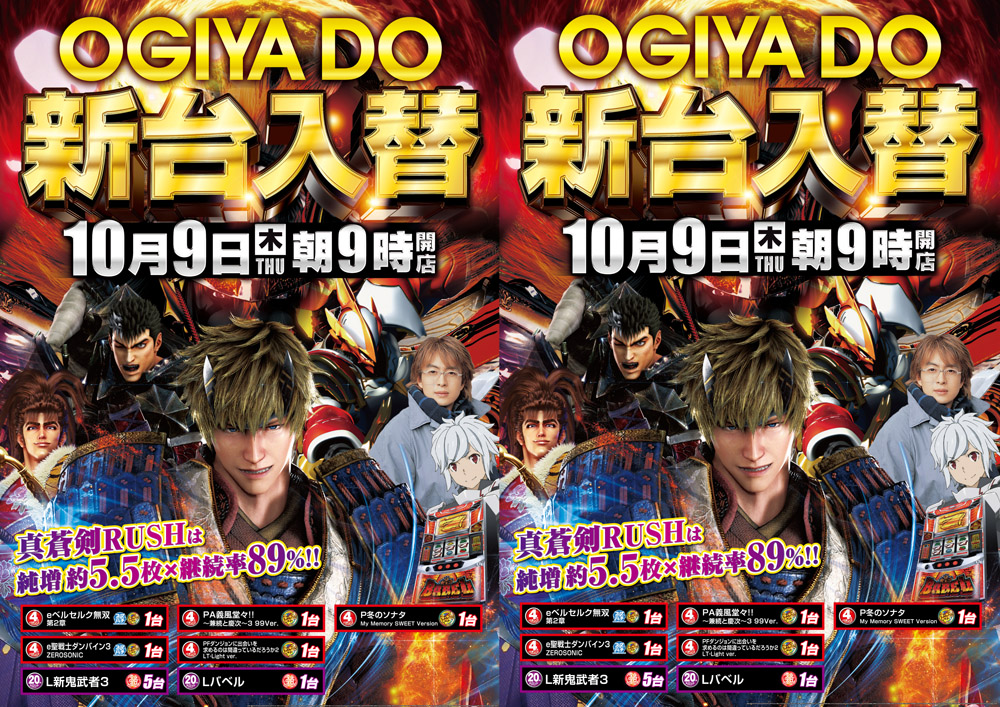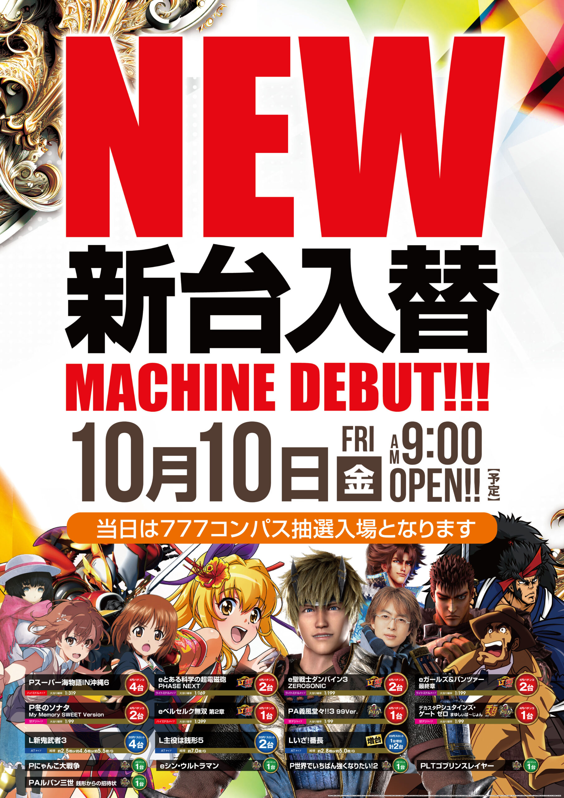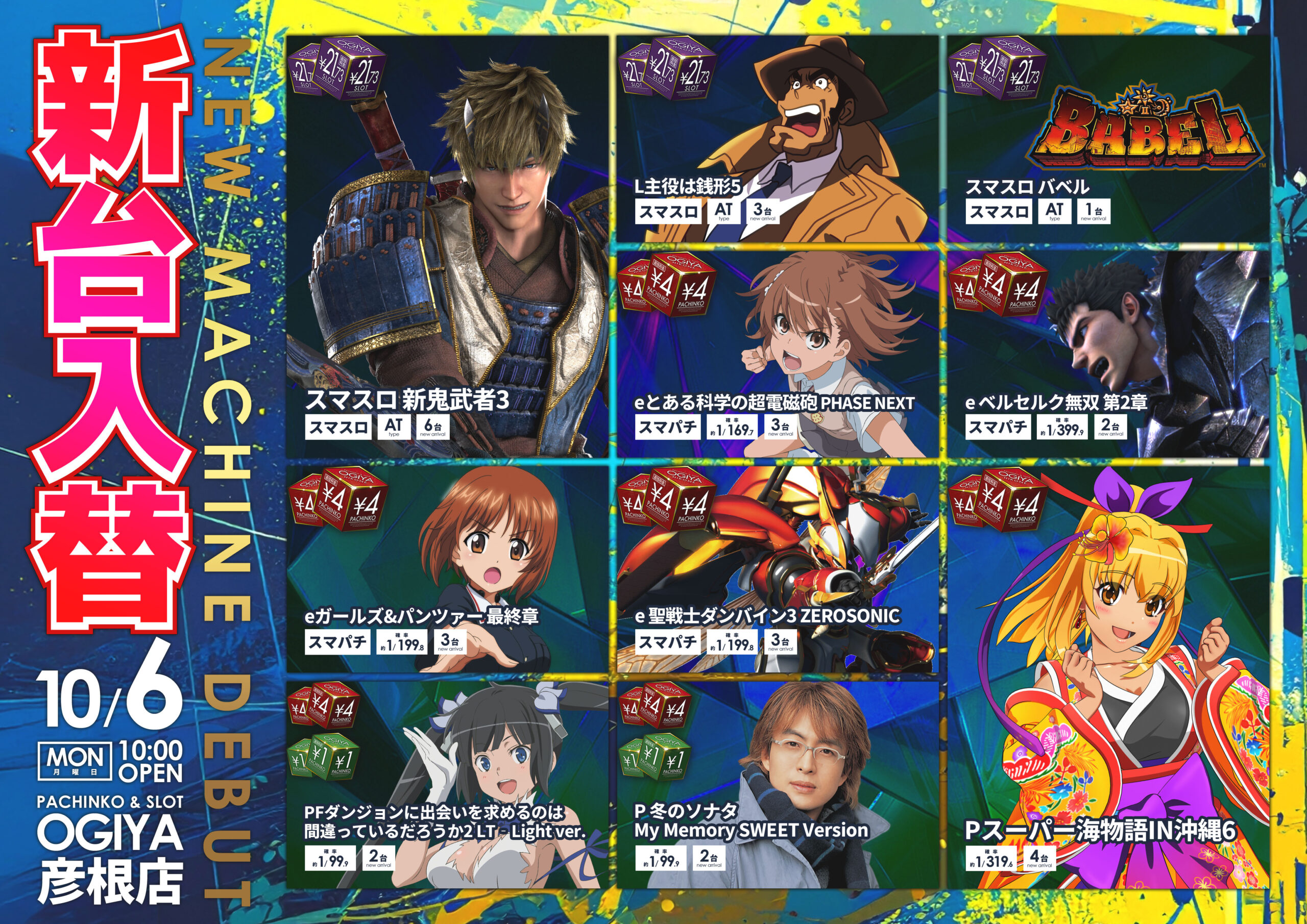 パチンコ Pスーパー海物語IN沖縄6 ハイミドル4台 eとある科学の超電磁砲PHASE NEXT ライトミドル2台 e聖戦士ダンバイン3ZEROSONIC ライトミドル2台 eガールズ&パンツァー最終章 ライトミドル2台 P冬のソナタMy Memory SWEET Ver 甘デジ2台 eベルセルク無双第2章 ハイミドル1台 PA義風堂々!!3 甘デジ1台 デカスタPシュタインズゲートゼロ 甘デジ1台
