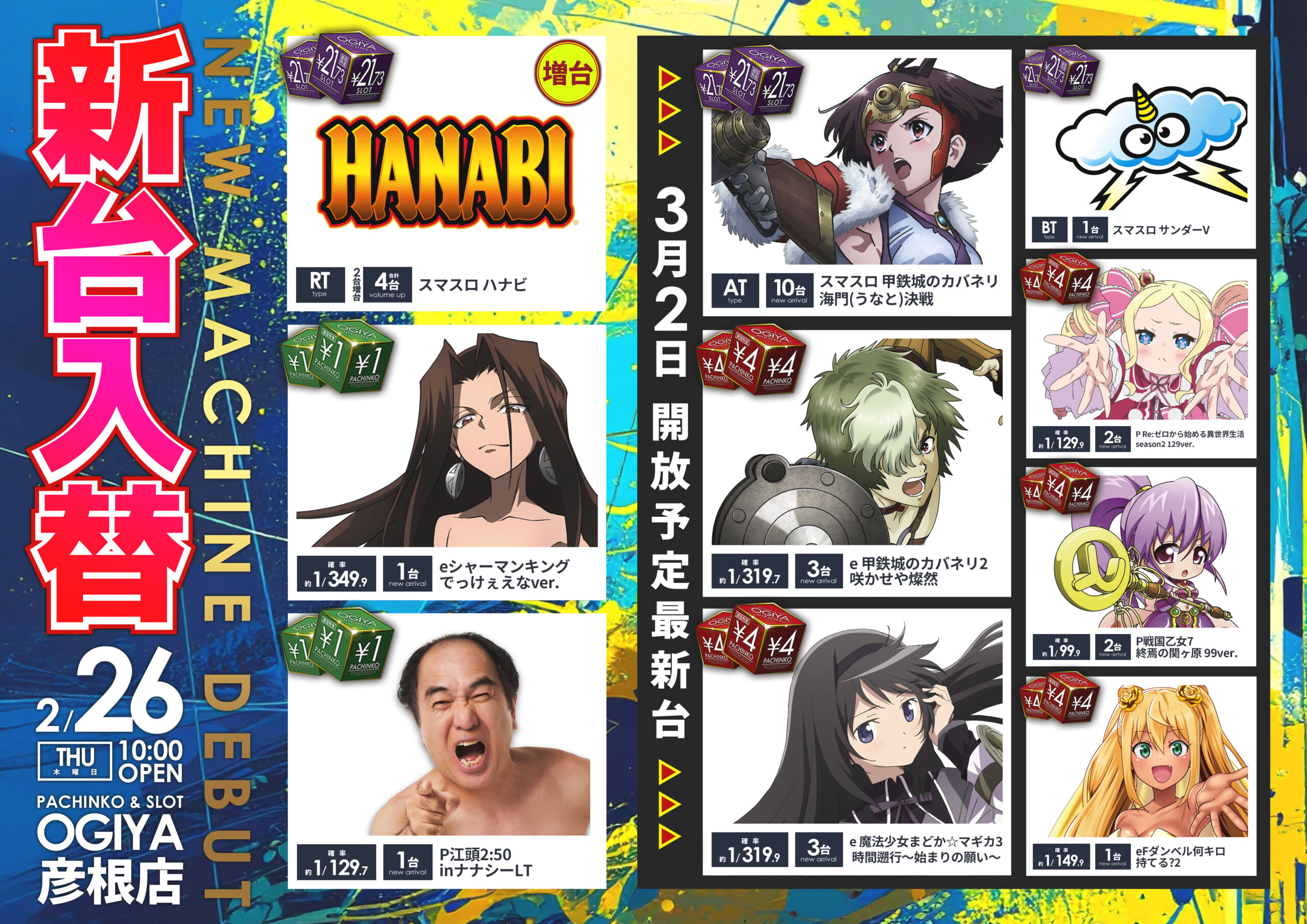 スロット L炎炎の消防隊2 AT3台 L攻殻機動隊 AT2台 Lハナビ A+RT2台 LゴブリンスレイヤーⅡ AT1台 L範馬刃牙 AT1台