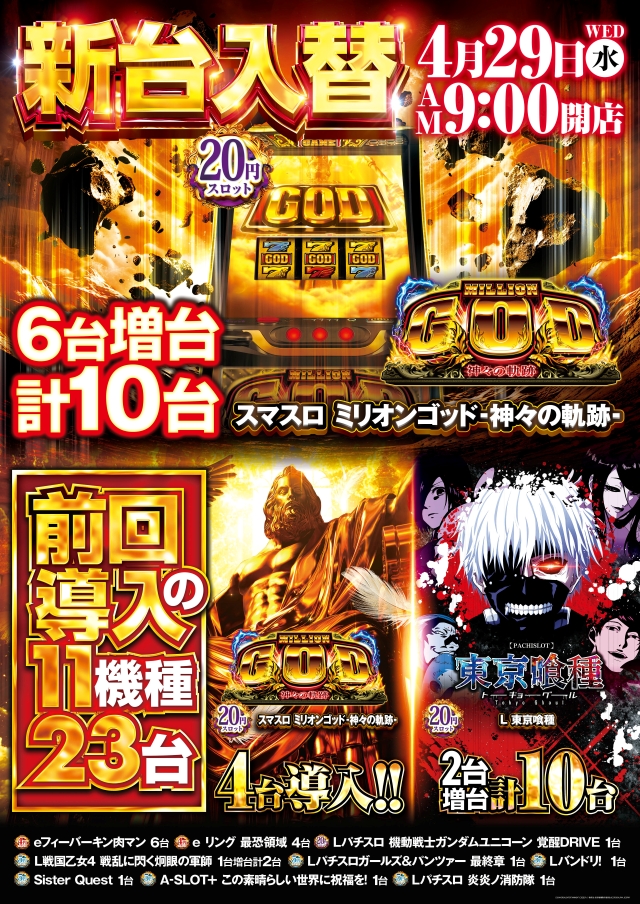 Sハナハナ鳳凰天翔-EX ノーマルタイプ9台 Lミリオンゴッド-神々の軌跡- AT5台 L東京喰種 AT3台増台 L機動戦士ガンダムユニコーン覚醒DRIVE AT3台