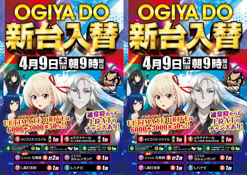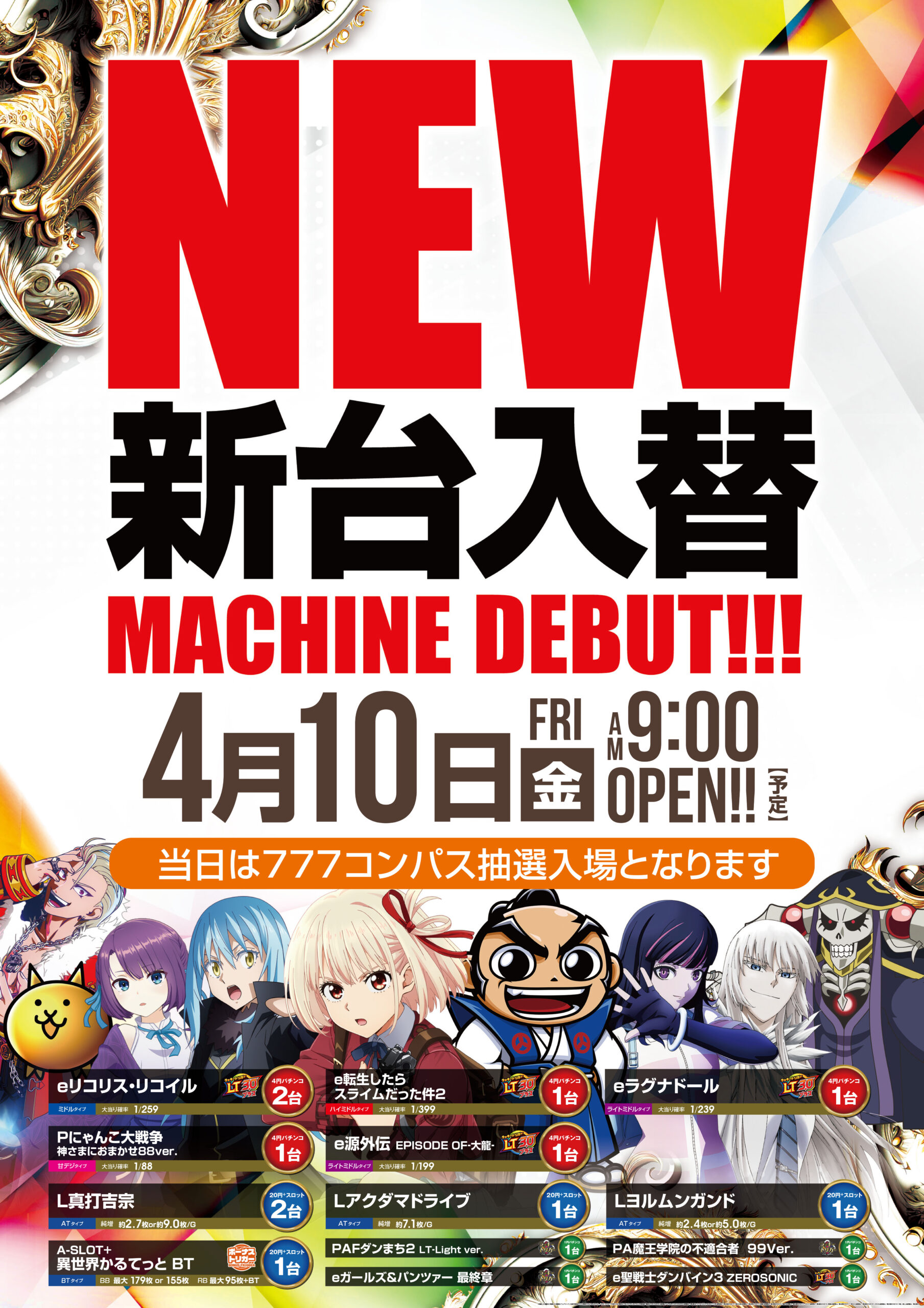 eリコリス・リコイル ミドル2台 e転スラ2 ハイミドル1台 eラグナドール ライトミドル1台 Pにゃんこ大戦争 甘デジ1台 e源外伝 ライトミドル1台